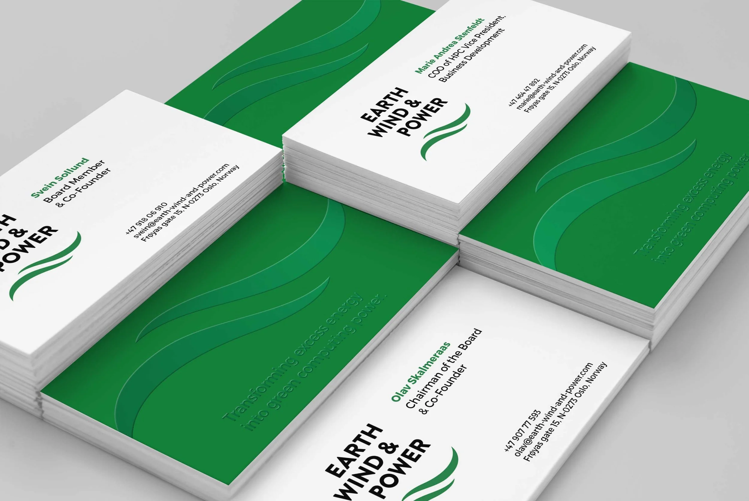 Identitet for Earth Wind & Power, et selskap som utnytter overflødig energi fra ulike ressurser og omskaper det til datakraft.